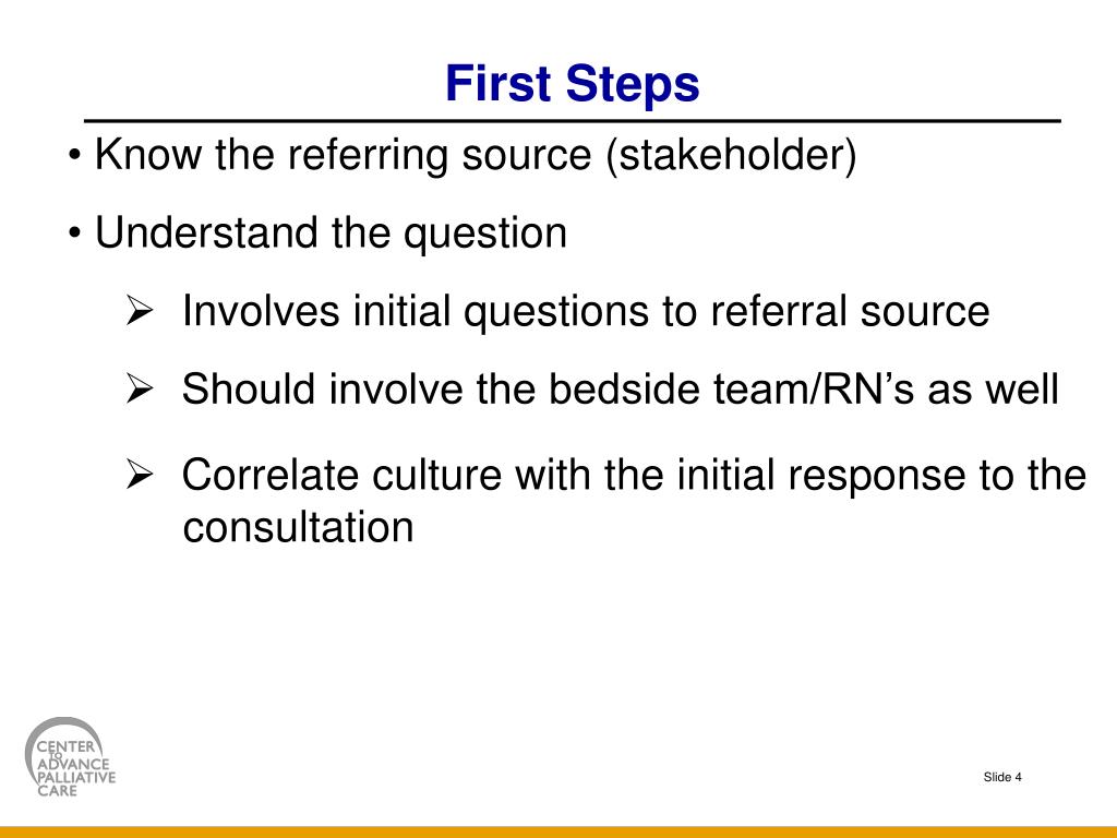 First Steps • Know the referring source (stakeholder) • Understand the question • Involves initial questions to referral source • Should involve the bedside team/RN’s as well • Correlate culture with the initial response to the • consultation