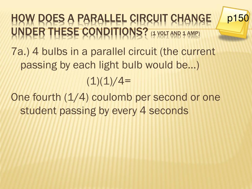 7a.) 4 bulbs in a parallel circuit (the current passing by each light bulb would be…) (1)(1)/4= One fourth (1/4) coulomb per second or one student passing by every 4 seconds p150 How does a parallel circuit change under these conditions? (1 volt and 1 amp)