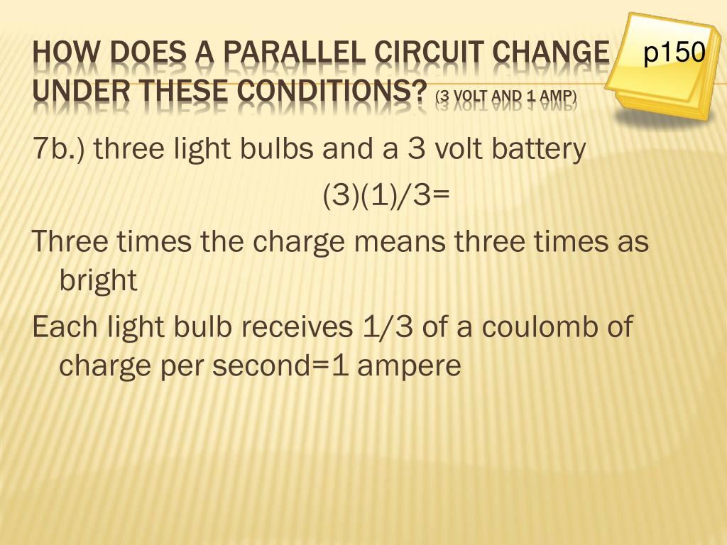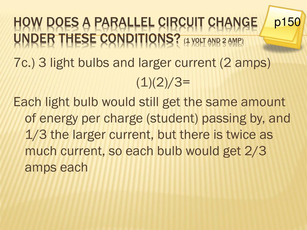 7c.) 3 light bulbs and larger current (2 amps) (1)(2)/3= Each light bulb would still get the same amount of energy per charge (student) passing by, and 1/3 the larger current, but there is twice as much current, so each bulb would get 2/3 amps each p150 How does a parallel circuit change under these conditions? (1 volt and 2 amp)