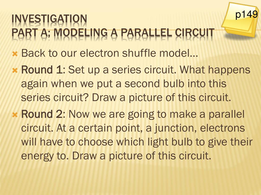 Back to our electron shuffle model… Round 1: Set up a series circuit. What happens again when we put a second bulb into this series circuit? Draw a picture of this circuit. Round 2: Now we are going to make a parallel circuit. At a certain point, a junction, electrons will have to choose which light bulb to give their energy to. Draw a picture of this circuit. p149 InvestigationPart A; Modeling a parallel circuit