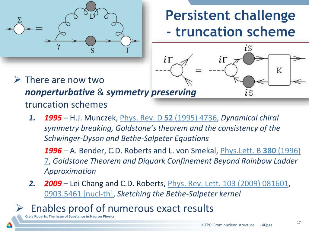 Persistent challenge- truncation scheme Craig Roberts: The Issue of Substance in Hadron Physics • There are now two nonperturbative & symmetry preserving truncation schemes • 1995 – H.J. Munczek, Phys. Rev. D 52 (1995) 4736,Dynamical chiral symmetry breaking, Goldstone’s theorem and the consistency of the Schwinger-Dyson and Bethe-Salpeter Equations 1996 – A. Bender, C.D. Roberts and L. von Smekal, Phys.Lett. B 380 (1996) 7, Goldstone Theorem and Diquark Confinement Beyond Rainbow Ladder Approximation • 2009 – Lei Chang and C.D. Roberts, Phys. Rev. Lett. 103 (2009) 081601, 0903.5461 [nucl-th], Sketching the Bethe-Salpeter kernel • Enables proof of numerous exact results