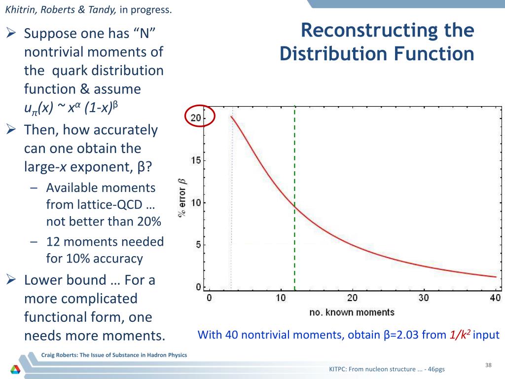 Khitrin, Roberts & Tandy,in progress. Reconstructing the Distribution Function With 40 nontrivial moments, obtain β=2.03 from1/k2 input Craig Roberts: The Issue of Substance in Hadron Physics • Suppose one has “N” nontrivial moments of the quark distribution function & assume uπ(x) ~ xα (1-x)β • Then, how accurately can one obtain the large-x exponent, β? • Available moments from lattice-QCD … not better than 20% • 12 moments needed for 10% accuracy • Lower bound … For a more complicated functional form, one needs more moments.