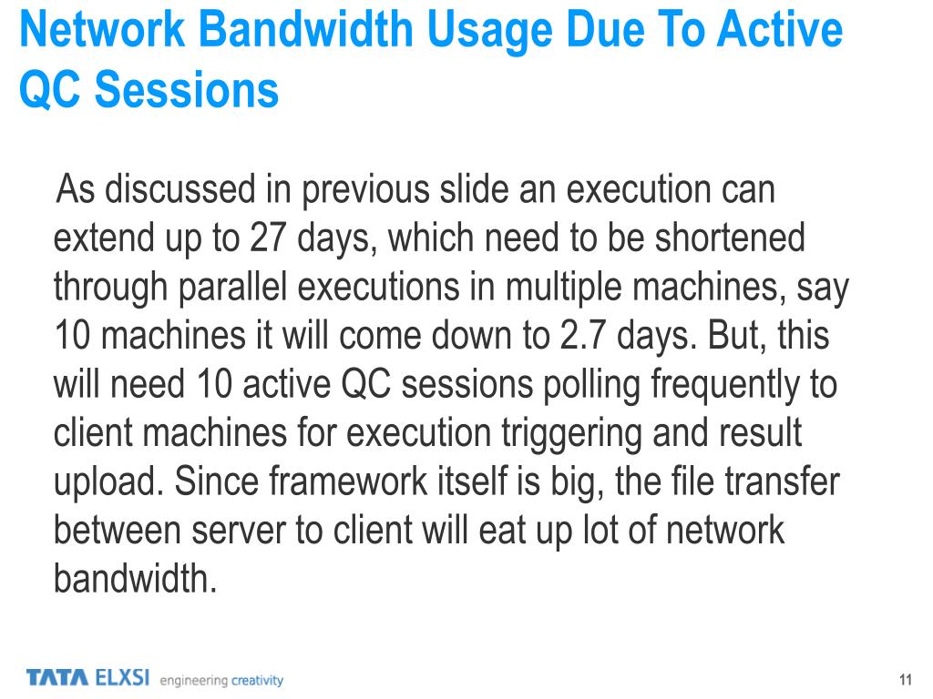 Network Bandwidth Usage Due To Active QC Sessions As discussed in previous slide an execution can extend up to 27 days, which need to be shortened through parallel executions in multiple machines, say 10 machines it will come down to 2.7 days. But, this will need 10 active QC sessions polling frequently to client machines for execution triggering and result upload. Since framework itself is big, the file transfer between server to client will eat up lot of network bandwidth.