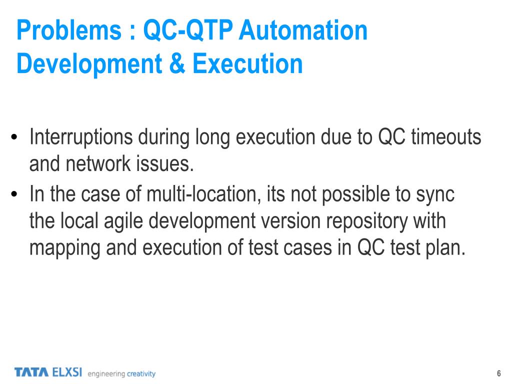 Problems : QC-QTP Automation Development & Execution • Interruptions during long execution due to QC timeouts and network issues. • In the case of multi-location, its not possible to sync the local agile development version repository with mapping and execution of test cases in QC test plan.