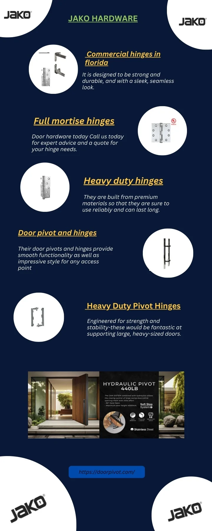 JAKO HARDWARE Commercial hinges in florida It is designed to be strong and durable, and with a sleek, seamless look. Full mortise hinges Door hardware today Call us today for expert advice and a quote for your hinge needs. Heavy duty hinges They are built from premium materials so that they are sure to use reliably and can last long. Door pivot and hinges Their door pivots and hinges provide smooth functionality as well as impressive style for any access point Heavy Duty Pivot Hinges Engineered for strength and stability-these would be fantastic at supporting large, heavy-sized doors. https://doorpivot.com/