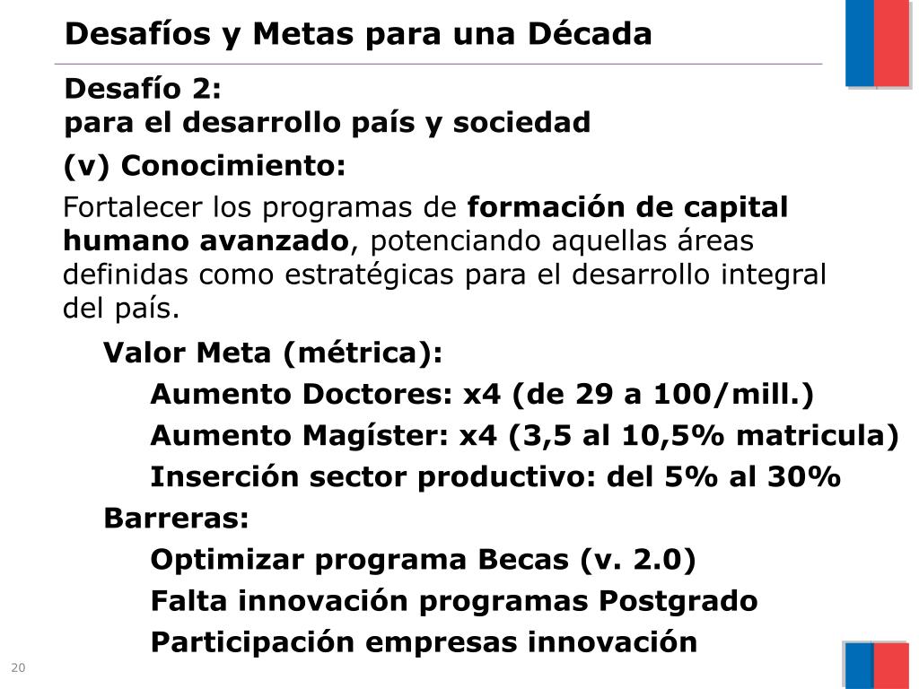 Desafíos y Metas para una Década Desafío 2: para el desarrollo país y sociedad (v) Conocimiento: Fortalecer los programas de formación de capital humano avanzado, potenciando aquellas áreas definidas como estratégicas para el desarrollo integral del país. Valor Meta (métrica): Aumento Doctores: x4 (de 29 a 100/mill.) Aumento Magíster: x4 (3,5 al 10,5% matricula) Inserción sector productivo: del 5% al 30% Barreras: Optimizar programa Becas (v. 2.0) Falta innovación programas Postgrado Participación empresas innovación