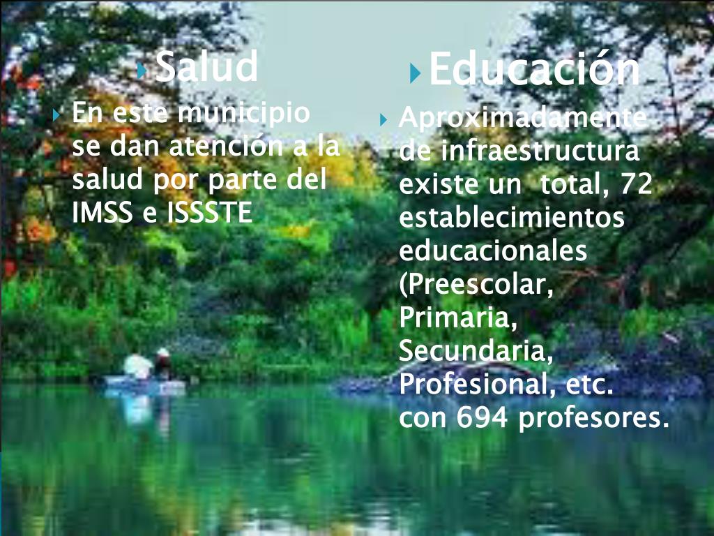 Salud • En este municipio se dan atención a la salud por parte del IMSS e ISSSTE • Educación • Aproximadamente de infraestructura existe un total, 72 establecimientos educacionales (Preescolar, Primaria, Secundaria, Profesional, etc. con 694 profesores.