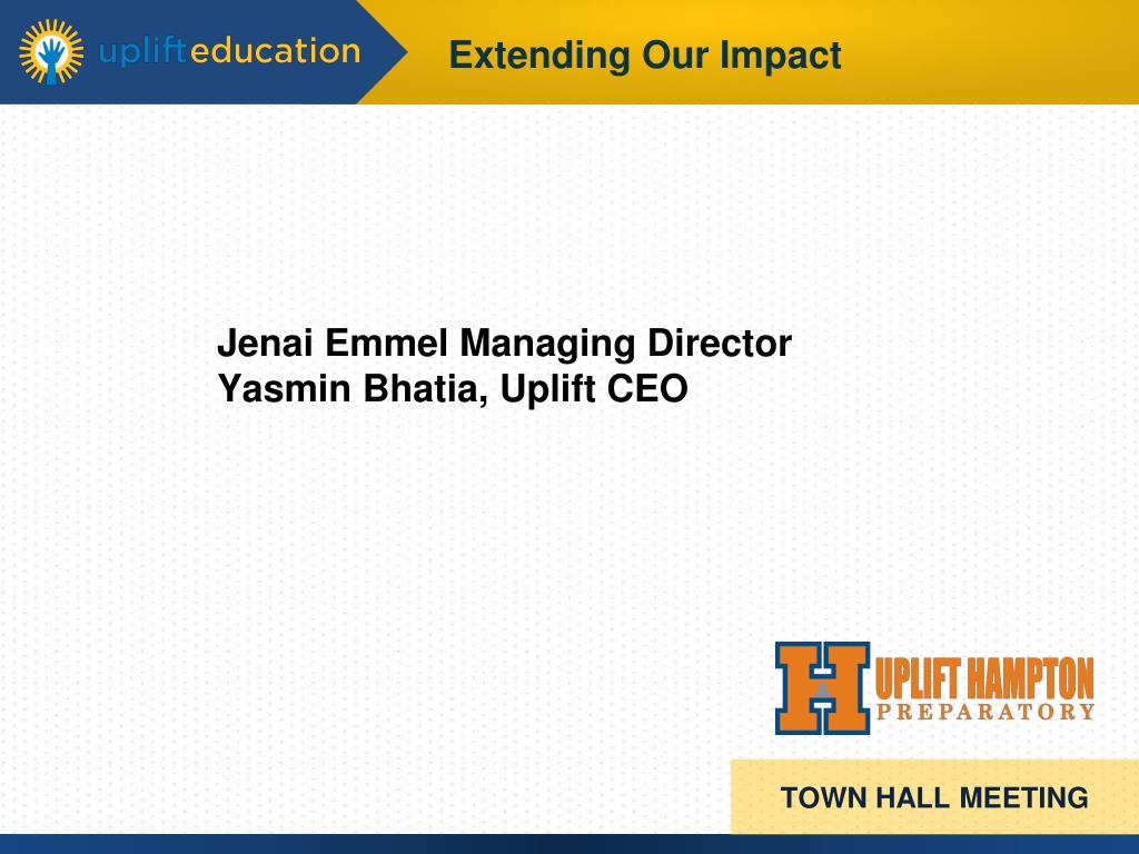 TOWN HALL MEETING. Jenai Emmel Managing Director Yasmin Bhatia, Uplift CEO. TOWN HALL MEETING. Our Successes. TOWN HALL MEETING. Academic Progress. TOWN HALL MEETING. 3 rd grade STAAR Performance. Primary Academic growth. Peer Comparison (% Met Level 2). Reading. Mathematics. 1. 1.