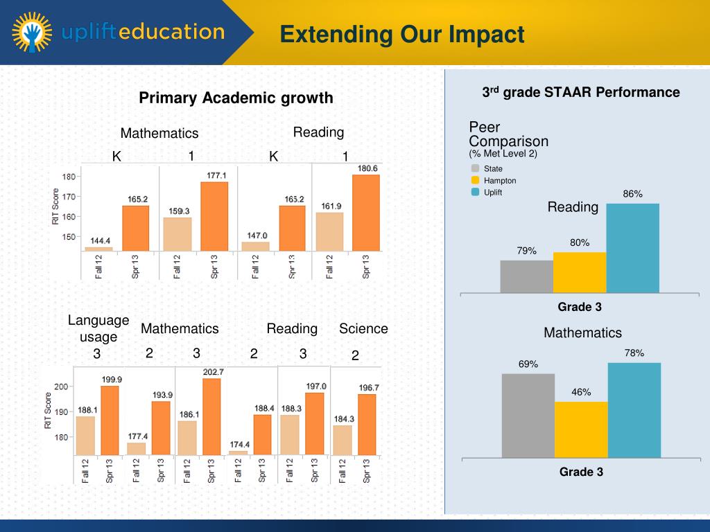 3rd grade STAAR Performance Primary Academic growth Peer Comparison(% Met Level 2) Reading Mathematics 1 1 K K State Hampton Uplift Reading Language usage Mathematics Reading Science Mathematics 3 2 2 3 3 2