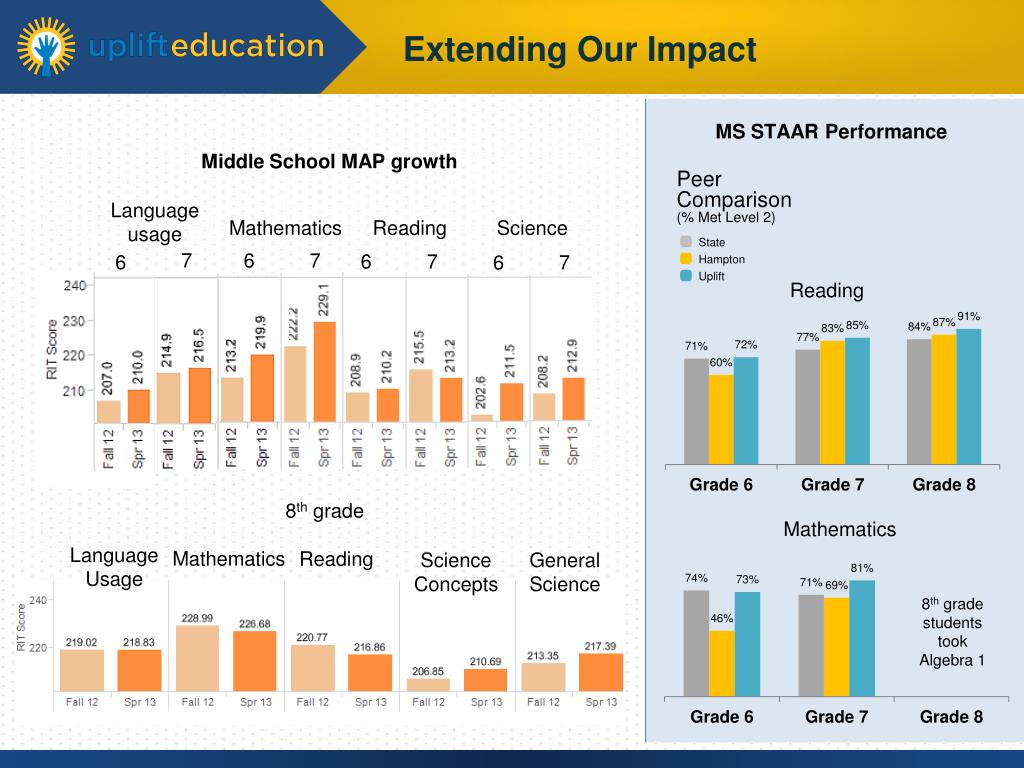 MS STAAR Performance Middle School MAP growth Peer Comparison(% Met Level 2) Language usage Science Mathematics Reading State 7 6 7 6 7 6 6 7 Hampton Uplift Reading 8th grade Mathematics Language Usage Mathematics Reading Science Concepts General Science 8th grade students took Algebra 1