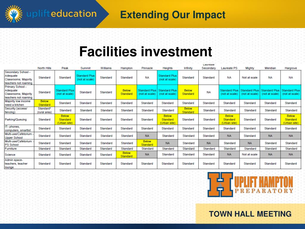 Facilities investment • Facilities are planned and built to support our academic programs • “Standards” exist for any Uplift school and we regularly assess how each school is doing relative to standards • Use bond funding to make sure every campus meets “standards”; philanthropy used for “extras” TOWN HALL MEETING