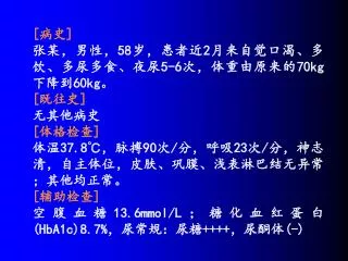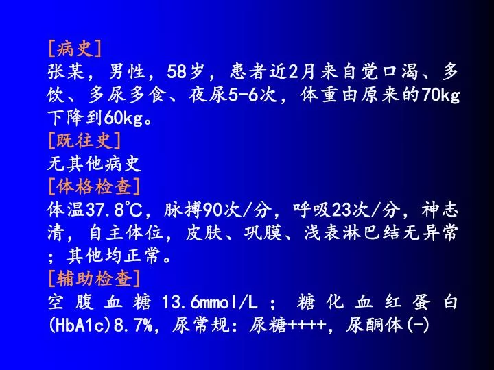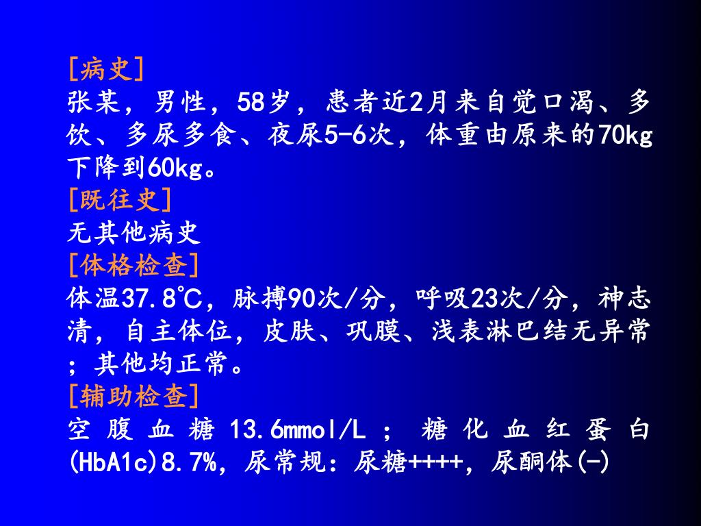 [病史] 张某,男性,58岁,患者近2月来自觉口渴、多饮、多尿多食、夜尿5-6次,体重由原来的70kg下降到60kg。 [既往史] 无其他病史 [体格检查] 体温37.8℃,脉搏90次/分,呼吸23次/分,神志清,自主体位,皮肤、巩膜、浅表淋巴结无异常;其他均正常。 [辅助检查] 空腹血糖13.6mmol/L;糖化血红蛋白(HbA1c)8.7%,尿常规:尿糖++++,尿酮体(-)