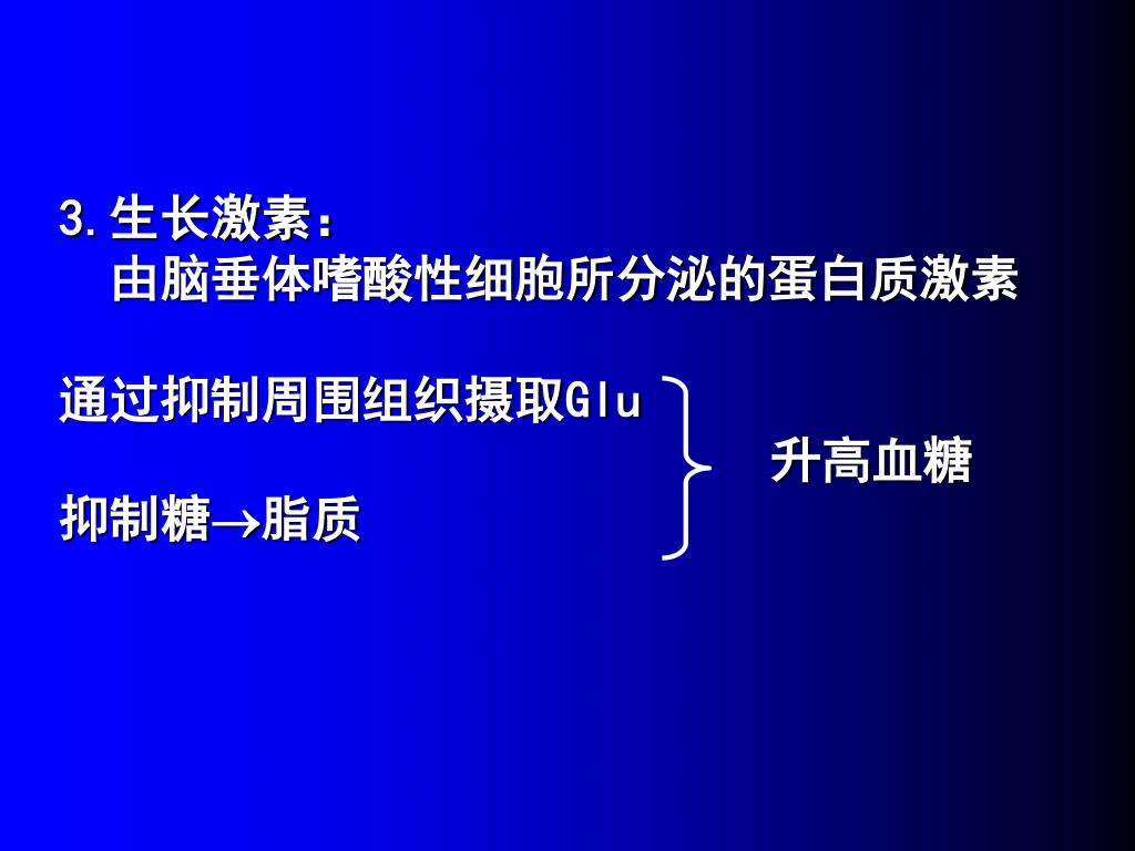 3.生长激素: 由脑垂体嗜酸性细胞所分泌的蛋白质激素通过抑制周围组织摄取Glu升高血糖抑制糖脂质