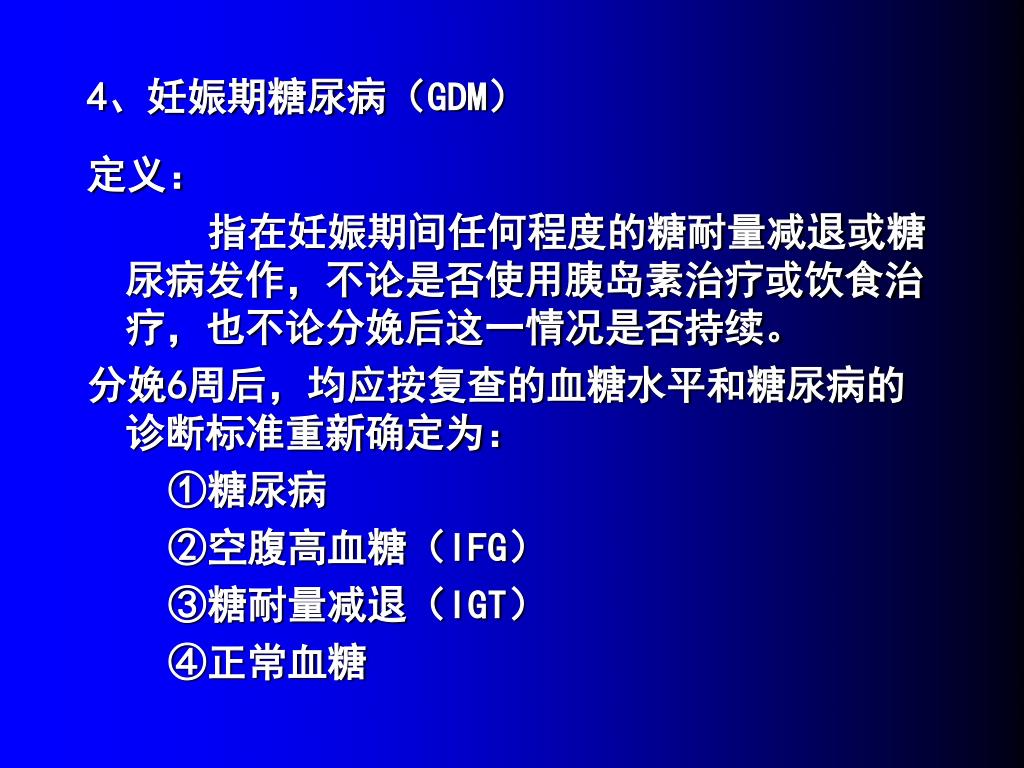 4、妊娠期糖尿病(GDM) 定义: 指在妊娠期间任何程度的糖耐量减退或糖尿病发作,不论是否使用胰岛素治疗或饮食治疗,也不论分娩后这一情况是否持续。 分娩6周后,均应按复查的血糖水平和糖尿病的诊断标准重新确定为: ①糖尿病 ②空腹高血糖(IFG) ③糖耐量减退(IGT) ④正常血糖