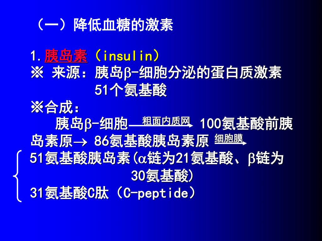 1.胰岛素(insulin)※ 来源:胰岛-细胞分泌的蛋白质激素 51个氨基酸※合成: 胰岛-细胞 粗面内质网 100氨基酸前胰岛素原86氨基酸胰岛素原 细胞膜51氨基酸胰岛素(链为21氨基酸、链为30氨基酸) 31氨基酸C肽(C-peptide) (一)降低血糖的激素