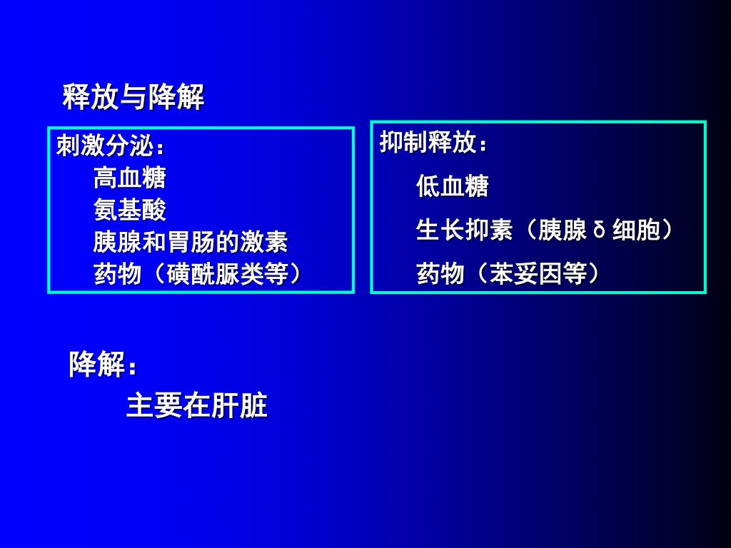 刺激分泌: 高血糖 氨基酸 胰腺和胃肠的激素 药物(磺酰脲类等) 降解: 主要在肝脏 释放与降解 抑制释放: 低血糖 生长抑素(胰腺δ细胞) 药物(苯妥因等)