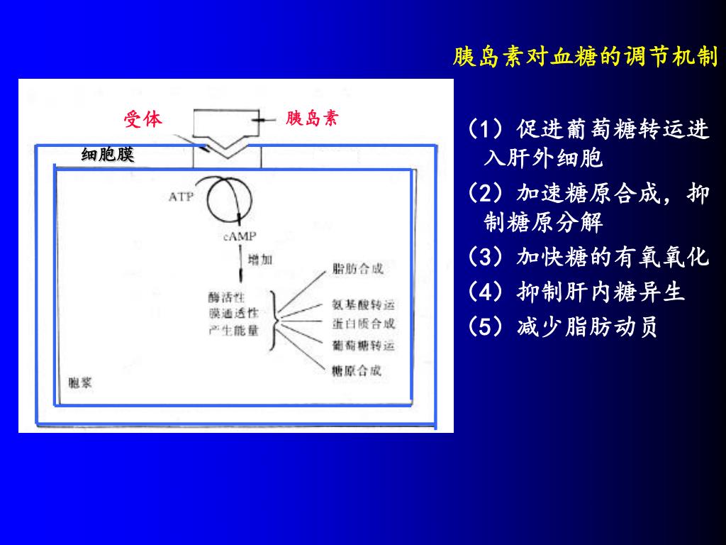 胰岛素对血糖的调节机制 受体 胰岛素 (1)促进葡萄糖转运进入肝外细胞 (2)加速糖原合成,抑制糖原分解 (3)加快糖的有氧氧化 (4)抑制肝内糖异生 (5)减少脂肪动员 细胞膜