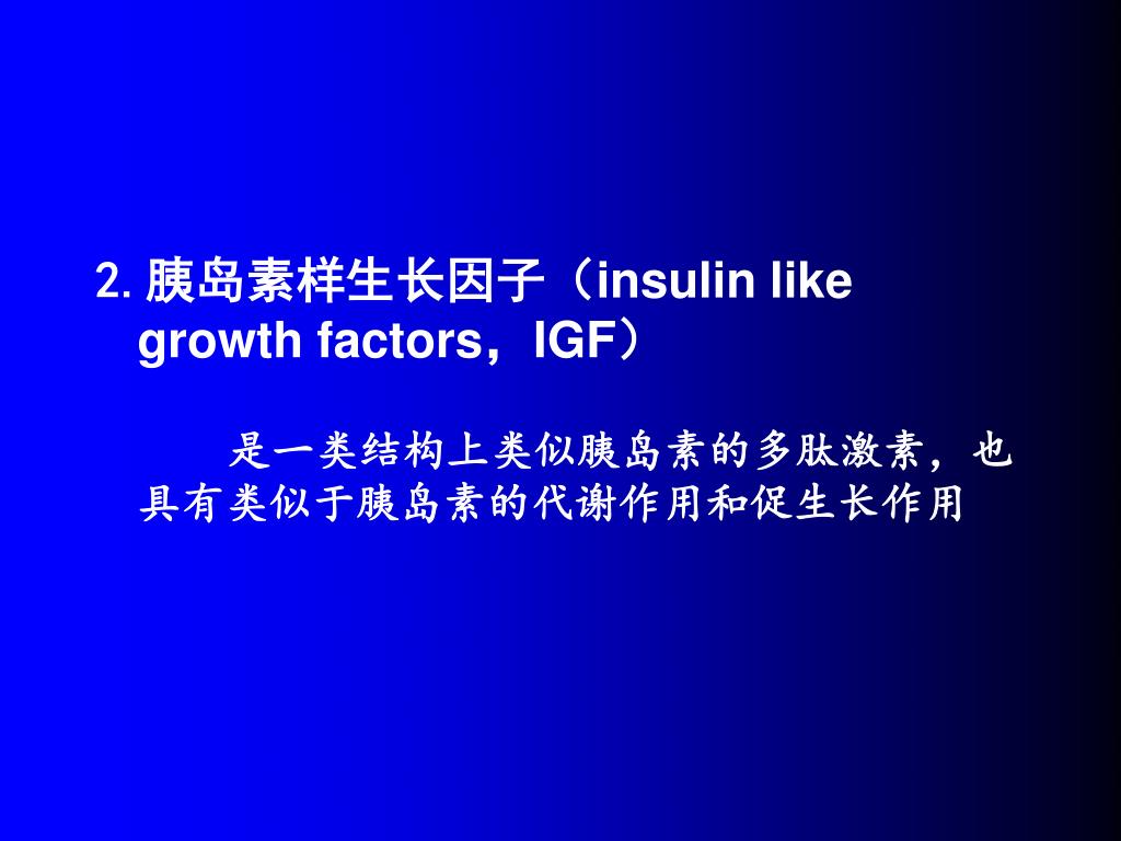 2.胰岛素样生长因子(insulin like growth factors,IGF) 是一类结构上类似胰岛素的多肽激素,也具有类似于胰岛素的代谢作用和促生长作用