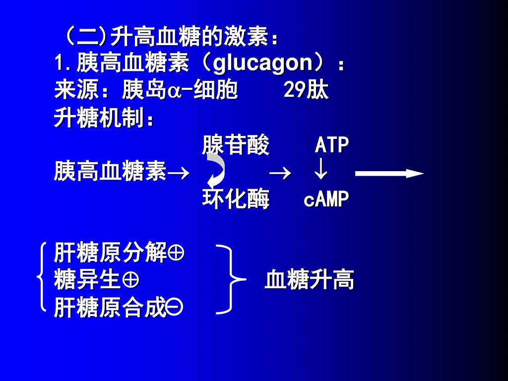 (二)升高血糖的激素:1.胰高血糖素(glucagon):来源:胰岛-细胞 29肽升糖机制: 腺苷酸 ATP胰高血糖素 环化酶 cAMP 肝糖原分解糖异生 血糖升高 肝糖原合成-