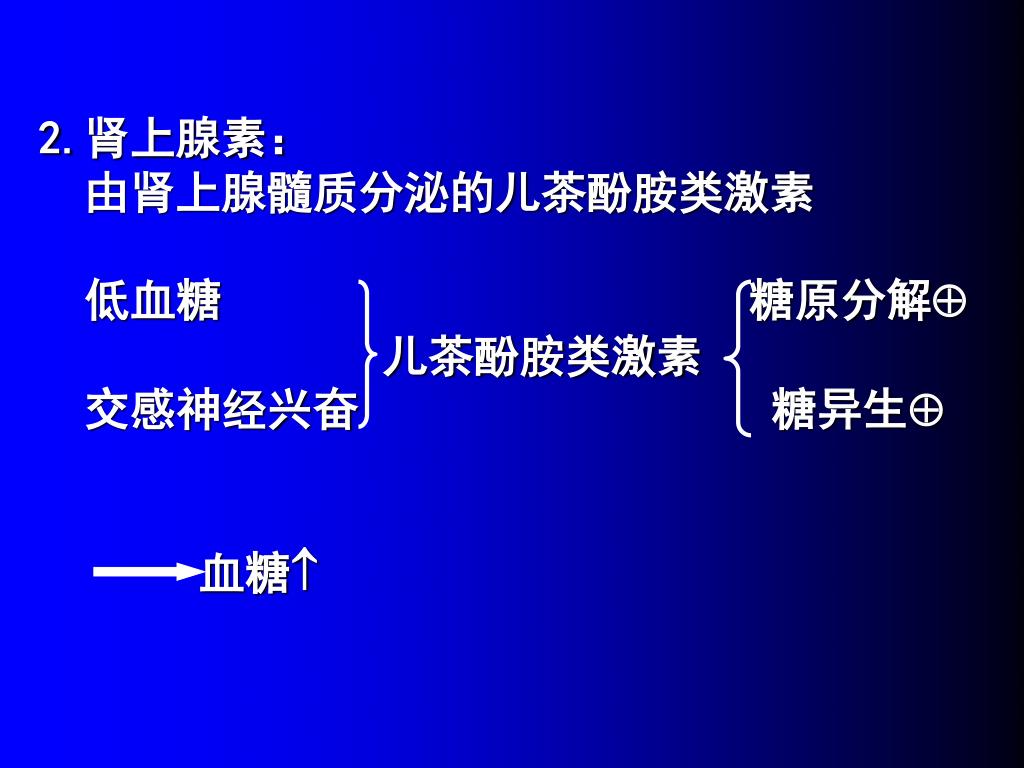 2.肾上腺素: 由肾上腺髓质分泌的儿茶酚胺类激素 低血糖 糖原分解 儿茶酚胺类激素 交感神经兴奋 糖异生血糖
