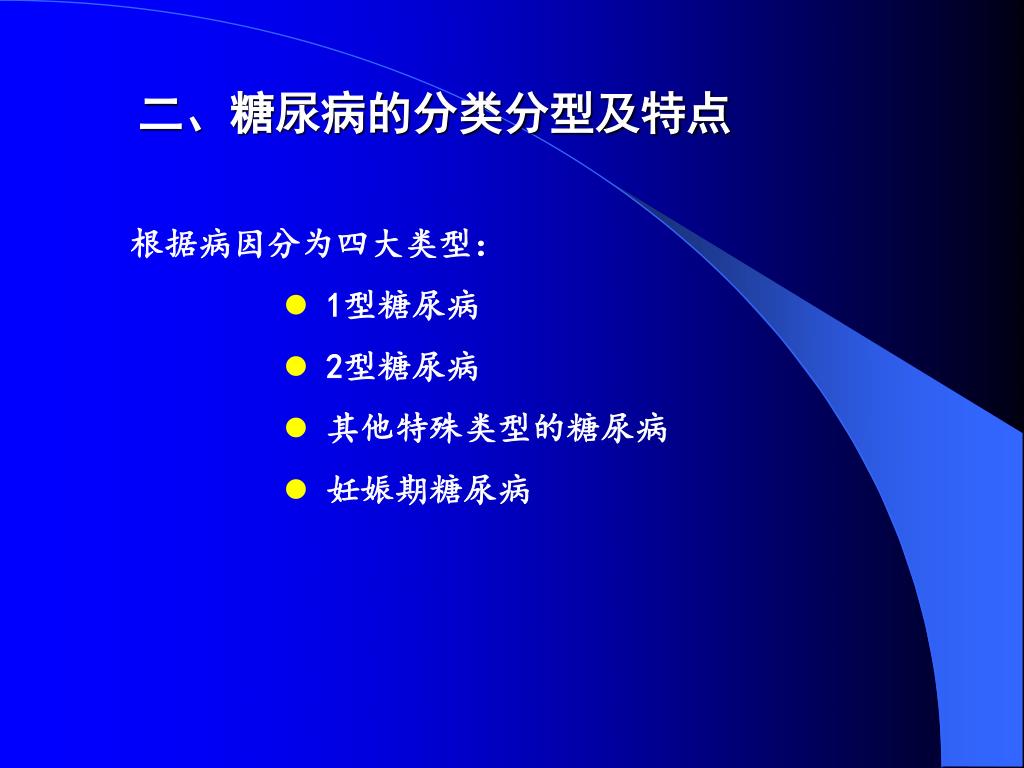 二、糖尿病的分类分型及特点 根据病因分为四大类型: • 1型糖尿病 • 2型糖尿病 • 其他特殊类型的糖尿病 • 妊娠期糖尿病