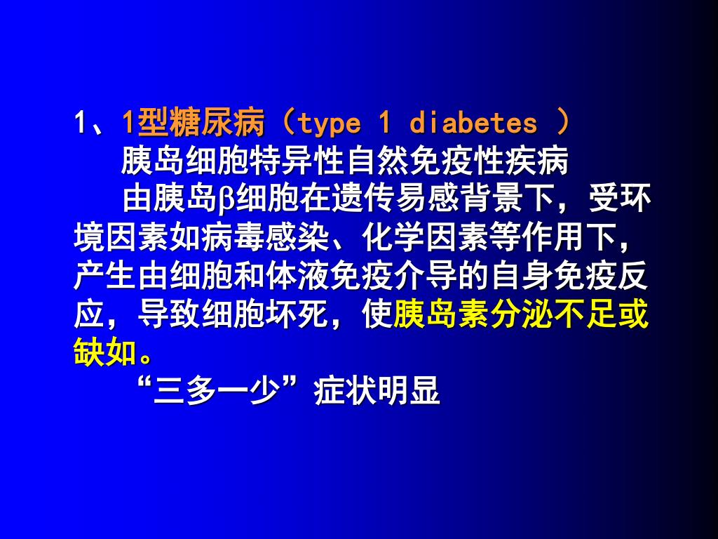 1、1型糖尿病(type 1 diabetes )胰岛细胞特异性自然免疫性疾病 由胰岛细胞在遗传易感背景下,受环境因素如病毒感染、化学因素等作用下,产生由细胞和体液免疫介导的自身免疫反应,导致细胞坏死,使胰岛素分泌不足或缺如。“三多一少”症状明显