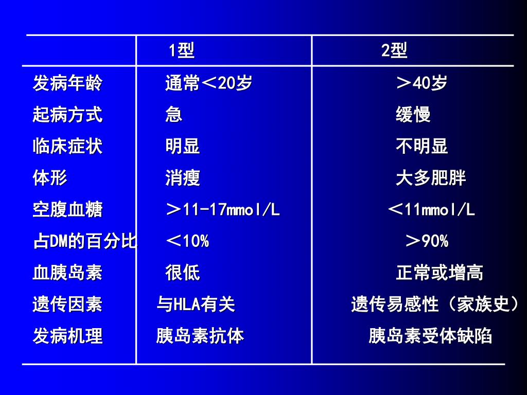 1型 2型 发病年龄 通常<20岁 >40岁 起病方式 急 缓慢 临床症状 明显 不明显 体形 消瘦 大多肥胖 空腹血糖 >11-17mmol/L <11mmol/L 占DM的百分比 <10% >90% 血胰岛素 很低 正常或增高 遗传因素 与HLA有关 遗传易感性(家族史) 发病机理 胰岛素抗体 胰岛素受体缺陷