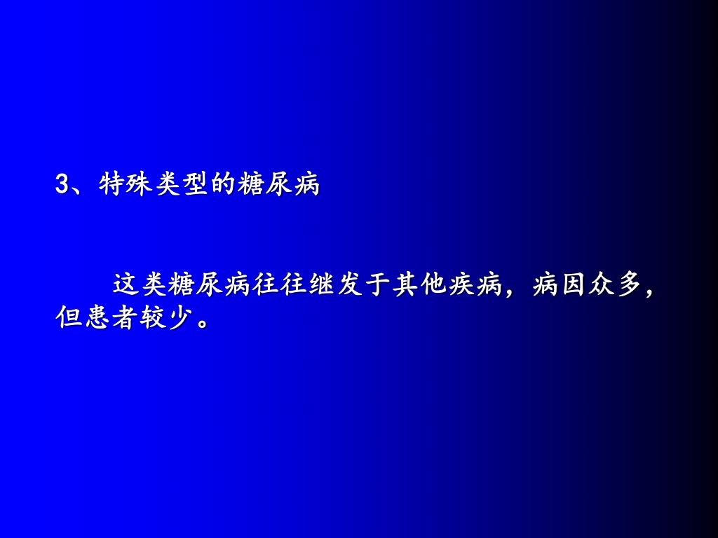 2、2型糖尿病( type 2 diabetes )血胰岛素量不低于正常 多发于肥胖型成年人 常伴有高血压、高血脂、肥胖等胰岛素抵 抗症候群 饮食控制或服降糖药可治疗 有遗传易感性