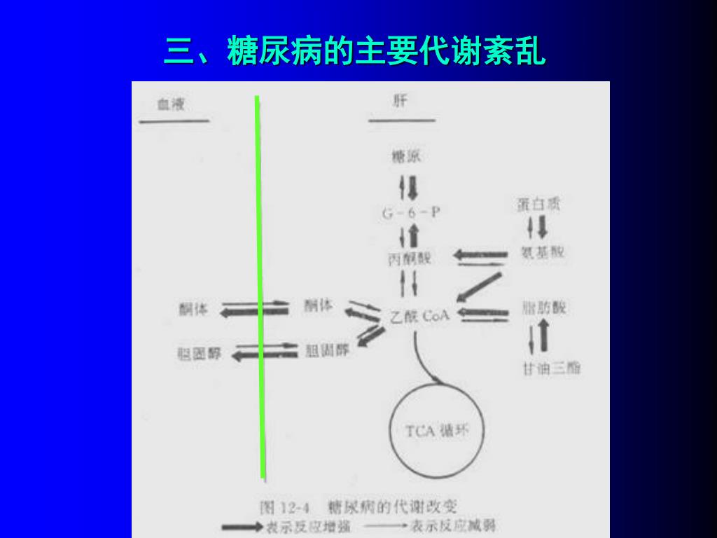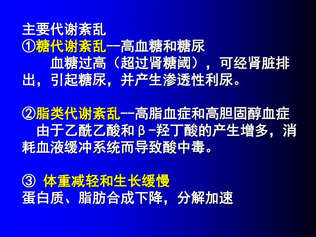 主要代谢紊乱①糖代谢紊乱--高血糖和糖尿 血糖过高(超过肾糖阈),可经肾脏排出,引起糖尿,并产生渗透性利尿。②脂类代谢紊乱--高脂血症和高胆固醇血症 由于乙酰乙酸和β-羟丁酸的产生增多,消耗血液缓冲系统而导致酸中毒。③ 体重减轻和生长缓慢蛋白质、脂肪合成下降,分解加速
