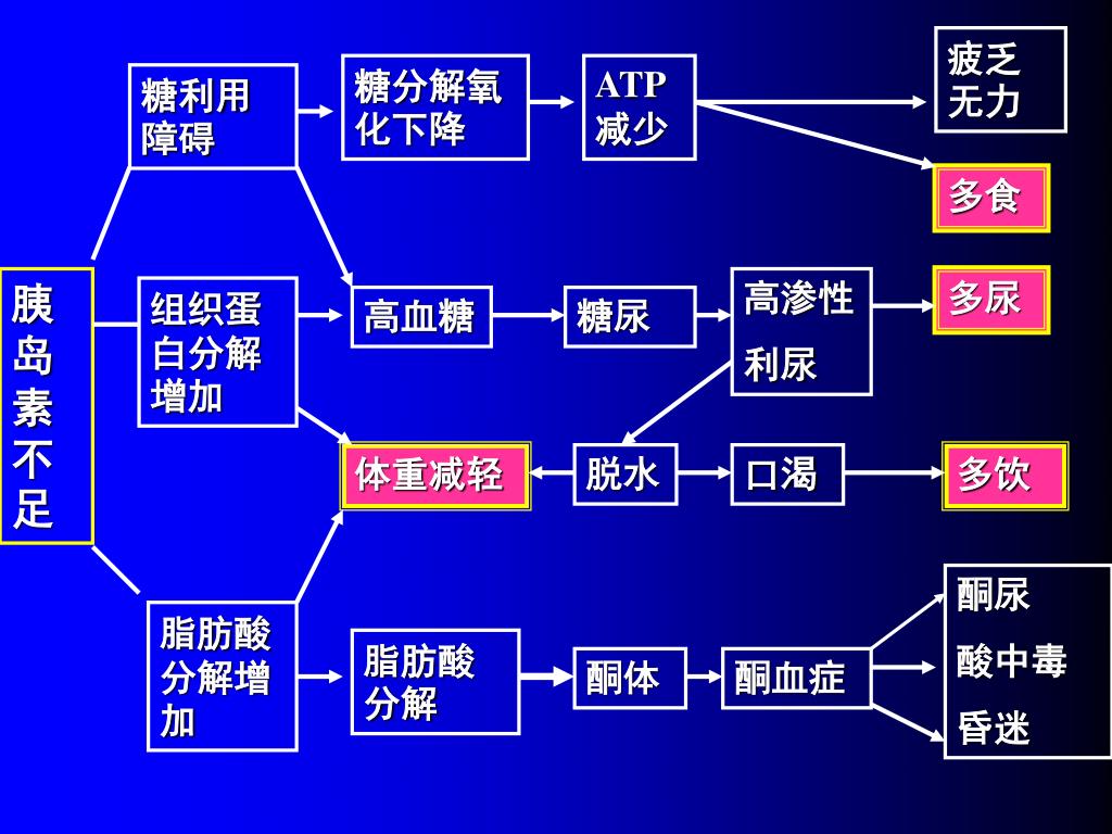 疲乏无力 糖分解氧化下降 ATP减少 糖利用障碍 多食 胰岛素不足 高渗性 利尿 多尿 组织蛋白分解增加 高血糖 糖尿 体重减轻 脱水 口渴 多饮 酮尿 酸中毒 昏迷 脂肪酸分解增加 脂肪酸分解 酮体 酮血症