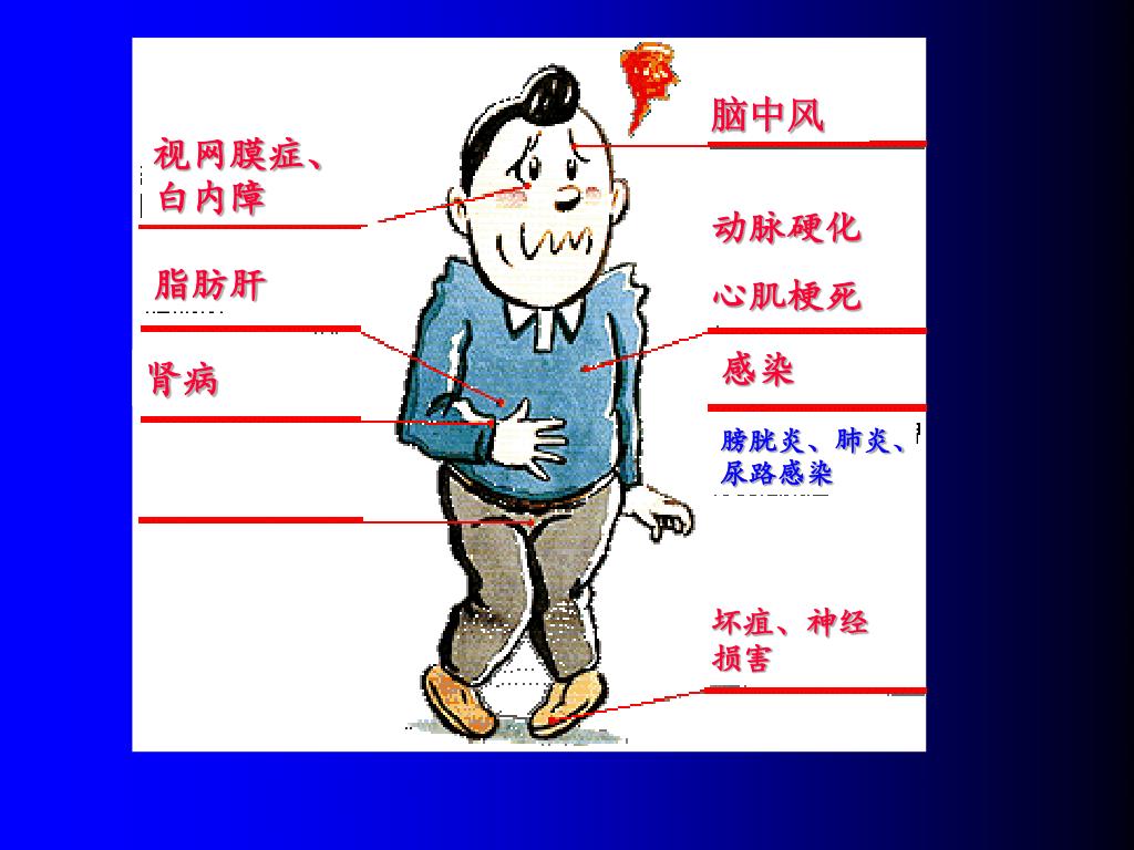 脑中风 视网膜症、白内障 动脉硬化 心肌梗死 脂肪肝 感染 肾病 膀胱炎、肺炎、尿路感染 坏疽、神经损害