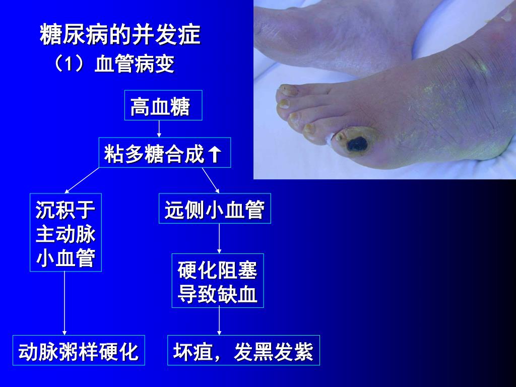 糖尿病的并发症 (1)血管病变 高血糖 粘多糖合成↑ 沉积于 主动脉 小血管 远侧小血管 硬化阻塞 导致缺血 动脉粥样硬化 坏疽,发黑发紫
