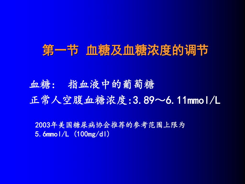 第一节 血糖及血糖浓度的调节 血糖: 指血液中的葡萄糖 正常人空腹血糖浓度:3.89~6.11mmol/L 2003年美国糖尿病协会推荐的参考范围上限为5.6mmol/L (100mg/dl)