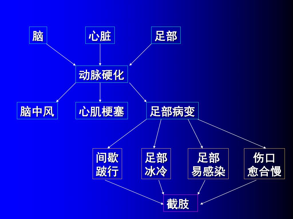 脑 心脏 足部 动脉硬化 脑中风 心肌梗塞 足部病变 间歇 跛行 足部 冰冷 足部 易感染 伤口 愈合慢 截肢