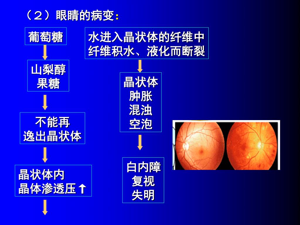 (2)眼睛的病变: 葡萄糖 水进入晶状体的纤维中 纤维积水、液化而断裂 山梨醇 果糖 晶状体 肿胀 混浊 空泡 不能再 逸出晶状体 白内障 复视 失明 晶状体内 晶体渗透压↑
