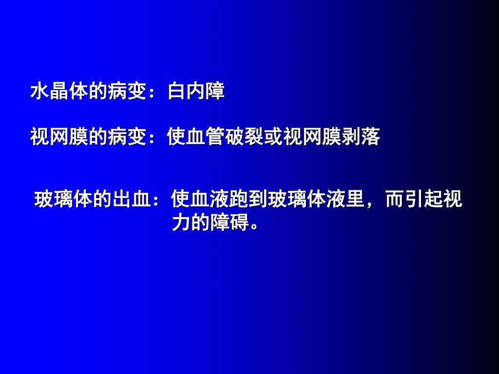 水晶体的病变:白内障 视网膜的病变:使血管破裂或视网膜剥落 玻璃体的出血:使血液跑到玻璃体液里,而引起视 力的障碍。