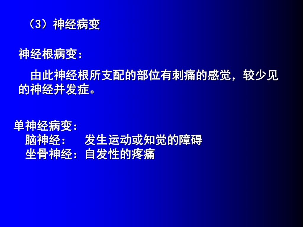 (3)神经病变 神经根病变: 由此神经根所支配的部位有刺痛的感觉,较少见的神经并发症。 单神经病变: 脑神经: 发生运动或知觉的障碍 坐骨神经:自发性的疼痛
