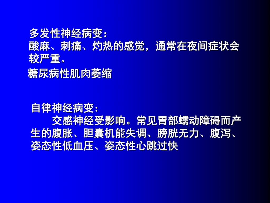 多发性神经病变: 酸麻、刺痛、灼热的感觉,通常在夜间症状会较严重。 糖尿病性肌肉萎缩 自律神经病变: 交感神经受影响。常见胃部蠕动障碍而产生的腹胀、胆囊机能失调、膀胱无力、腹泻、姿态性低血压、姿态性心跳过快