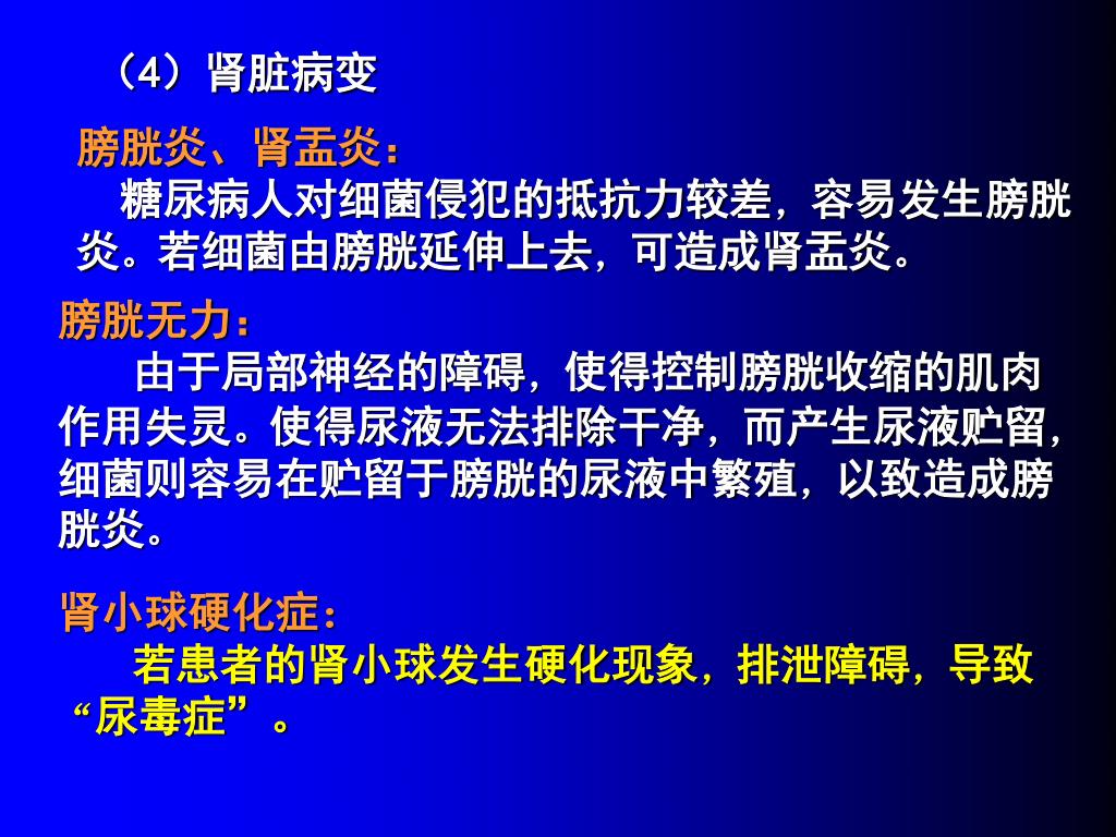 (4)肾脏病变 膀胱炎、肾盂炎:糖尿病人对细菌侵犯的抵抗力较差,容易发生膀胱炎。若细菌由膀胱延伸上去,可造成肾盂炎。 膀胱无力:由于局部神经的障碍,使得控制膀胱收缩的肌肉作用失灵。使得尿液无法排除干净,而产生尿液贮留,细菌则容易在贮留于膀胱的尿液中繁殖,以致造成膀胱炎。 肾小球硬化症:若患者的肾小球发生硬化现象,排泄障碍,导致“尿毒症”。