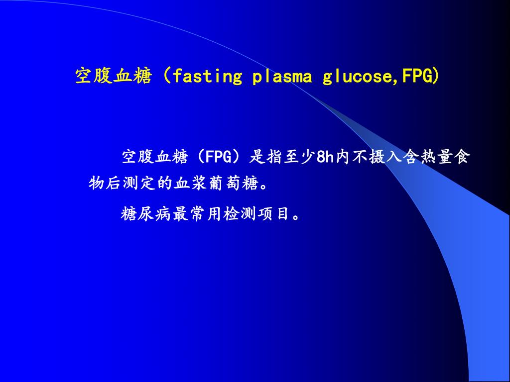 空腹血糖(fasting plasma glucose,FPG) 空腹血糖(FPG)是指至少8h内不摄入含热量食物后测定的血浆葡萄糖。 糖尿病最常用检测项目。
