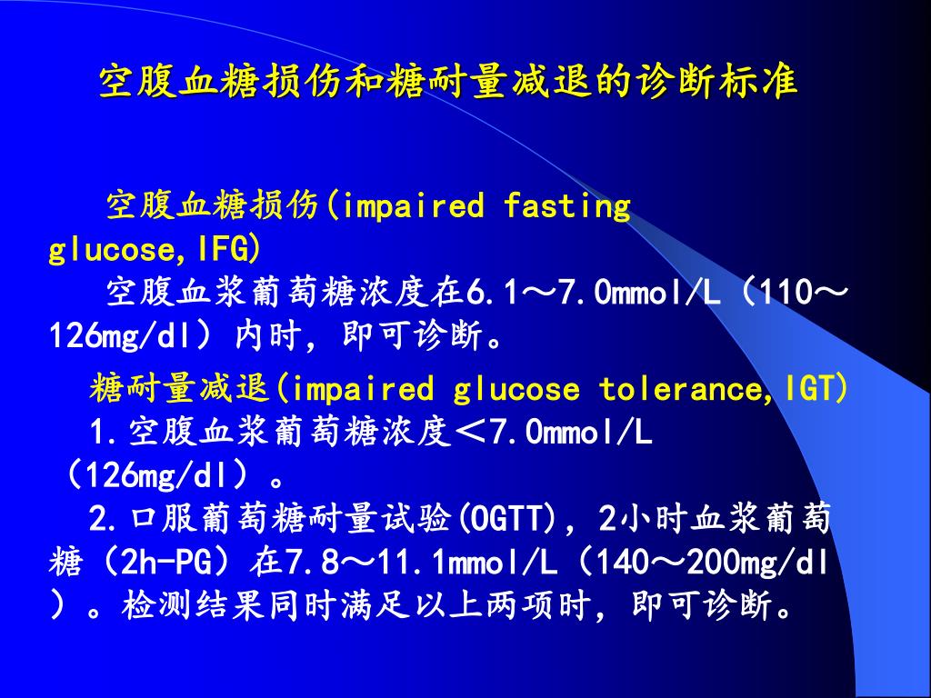 四、糖尿病的诊断(WHO 2001年) 1、出现糖尿病症状并加上随机血糖≥11.1mmol/L(200mg/dl)。 随机是指一天内任何时间,不管上次用餐时间。典型糖尿病症状包括多尿、多饮和不明原因的体重下降。 2、空腹血糖≥7.0mmol/L(126mg/dl) 空腹指至少8小时内无含热量食物的摄取。 3、口服葡萄糖耐量实验(OGTT), 2小时血糖≥11.1mmol/L(200mg/dl)。 成人口服75克葡萄糖,儿童每公斤体重用1.75克、总量不超过75克 注:任何一种方法出现阳性,必须用另外一种方法进行复查才能正式确诊。