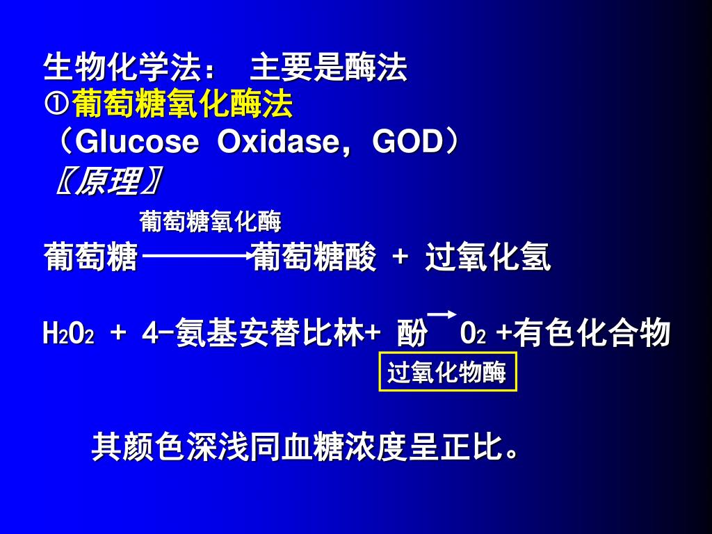 生物化学法: 主要是酶法葡萄糖氧化酶法(Glucose Oxidase,GOD)〖原理〗 葡萄糖氧化酶葡萄糖 葡萄糖酸 + 过氧化氢H2O2 + 4-氨基安替比林+ 酚 O2 +有色化合物 其颜色深浅同血糖浓度呈正比。 过氧化物酶