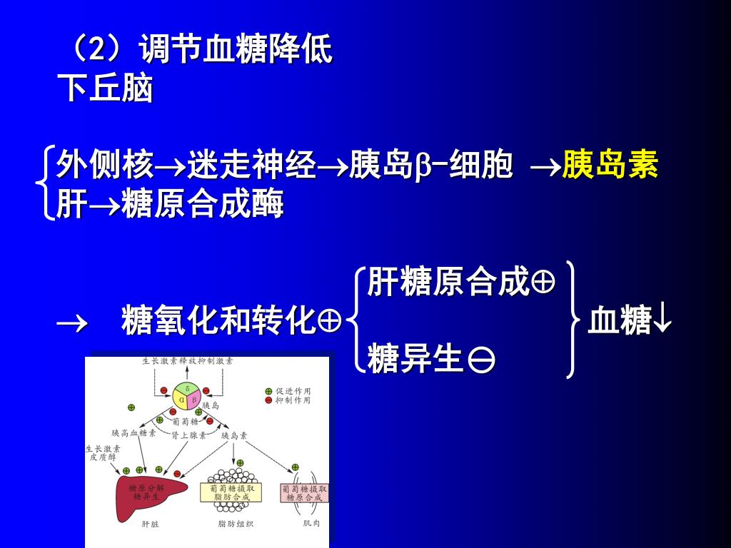 2.神经系统的调节:主要是下丘脑和植物神经系统起作用(1)调节血糖升高下丘脑 腹内侧核内脏神经肾上腺髓质肾上腺素 胰岛-细胞胰高血糖素肝G-6-P酶 肝糖原分解血糖糖异生
