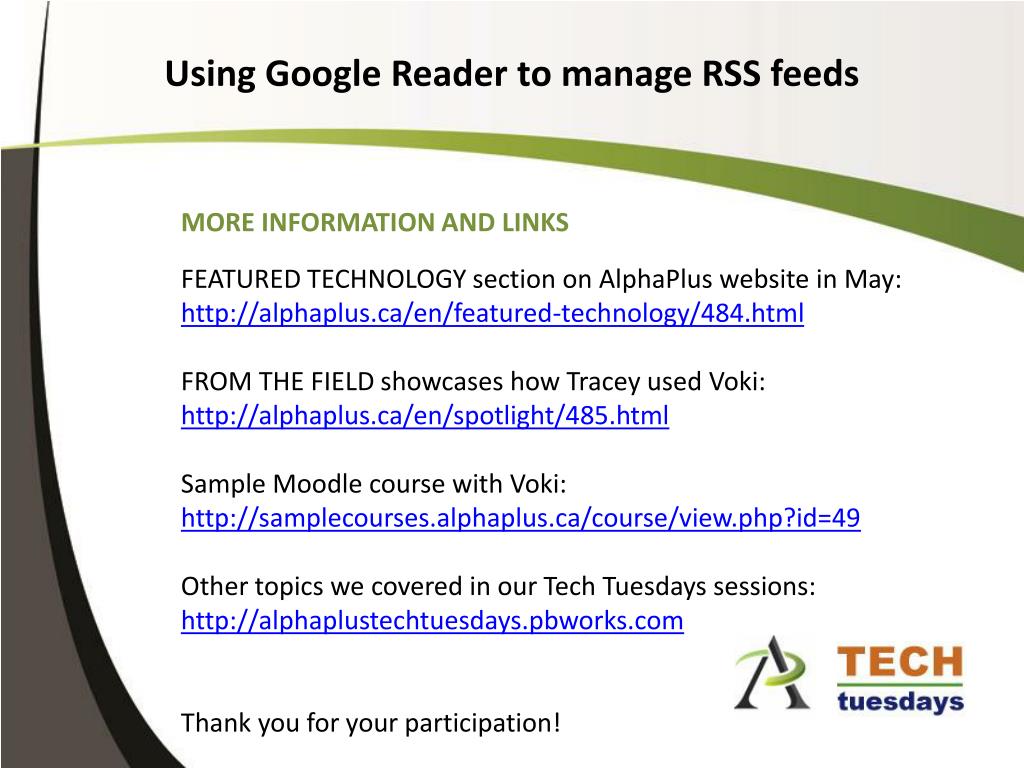 MORE INFORMATION AND LINKS Using Google Reader to manage RSS feeds FEATURED TECHNOLOGY section on AlphaPlus website in May: http://alphaplus.ca/en/featured-technology/484.html FROM THE FIELD showcases how Tracey used Voki: http://alphaplus.ca/en/spotlight/485.html Sample Moodle course with Voki: http://samplecourses.alphaplus.ca/course/view.php?id=49 Other topics we covered in our Tech Tuesdays sessions: http://alphaplustechtuesdays.pbworks.com Thank you for your participation!