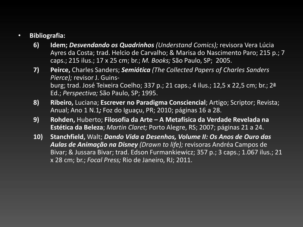 Bibliografia: 6) Idem;Desvendando os Quadrinhos(Understand Comics); revisora Vera LúciaAyres da Costa; trad. Helcio de Carvalho; & Marisa do Nascimento Paro; 215 p.; 7 caps.; 215 ilus.; 17 x 25 cm; br.; M. Books; São Paulo, SP; 2005. 7) Peirce, Charles Sanders; Semiótica (TheCollectedPapers of Charles Sanders Pierce); revisor J. Guins-burg; trad. José Teixeira Coelho; 337 p.; 21 caps.; 4 ilus.;12,5 x 22,5 cm; br.; 2ª Ed.; Perspectiva; São Paulo, SP; 1995. 8) Ribeiro, Luciana; Escrever no Paradigma Consciencial; Artigo; Scriptor; Revista; Anual; Ano 1 N.1; Foz do Iguaçu, PR; 2010; páginas 16 a 28. 9) Rohden, Huberto; Filosofia da Arte – A Metafísica da Verdade Revelada na Estética da Beleza;Martin Claret; Porto Alegre, RS; 2007; páginas 21 a 24. 10) Stanchfield, Walt; Dando Vida a Desenhos, Volume II: Os Anos de Ouro das Aulas de Animaçãona Disney (Drawntolife); revisoras Andréa Campos de Bivar; & JussaraBivar; trad. EdsonFurmankiewicz; 357 p.; 3 caps.; 1.067 ilus.; 21 x 28 cm; br.; Focal Press; Rio de Janeiro, RJ; 2011.