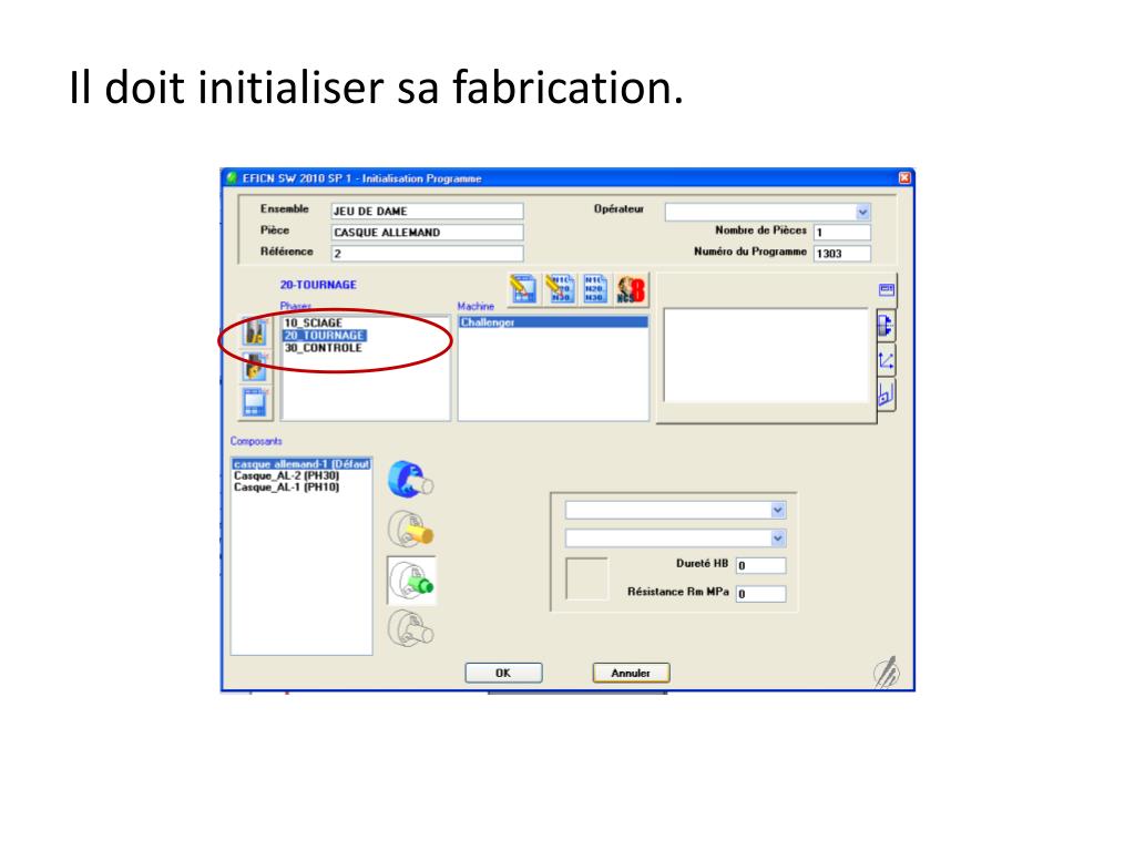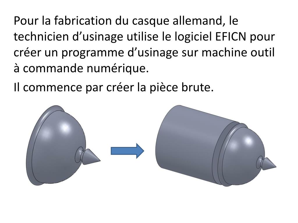 Fabrication du casque allemand. Pour la fabrication du casque allemand, le technicien d’usinage utilise le logiciel EFICN pour créer un programme d’usinage sur machine outil à commande numérique. Il commence par créer la pièce brute. Il doit initialiser sa fabrication.