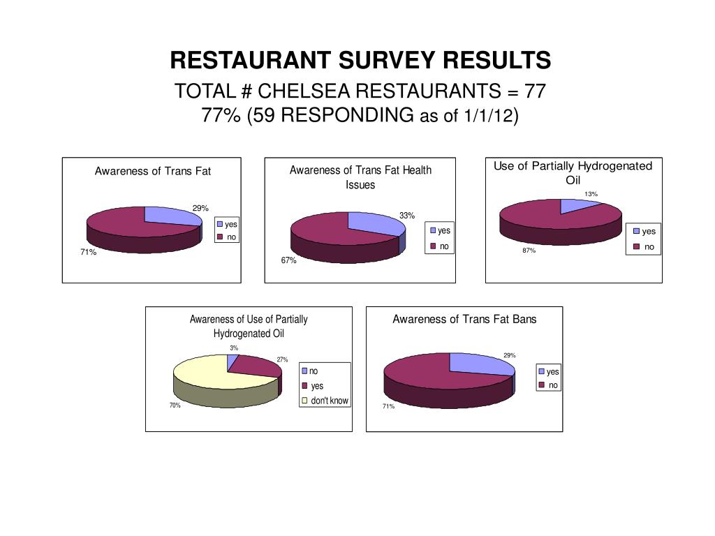 Clarifying the distinction between prior trans fat regulations & Chelsea’s approach From the Boston regulation passed in March 2008 “artificial trans fat” - food or beverage that is labeled as, lists as an ingredient, contains or is prepared with vegetable shortening, margarine or any kind of partially hydrogenated vegetable oil. However, a food or beverage whose nutrition facts label or other suitable documentation lists the trans fat content of the food as less than 0.5 grams per serving shall not be deemed to contain artificial trans fat. From Chelsea’s regulation, passed December 2011 SECTION 1: DEFINITIONS (A) Artificial Trans Fat – any ingredient that is partially hydrogenated. Artificial trans fats are commonly found in vegetable oils, butter substitutes, shortening, margarine, cake mixes and frosting. SECTION II: PROHIBITION “No food service establishment, vending machine, or mobile food vendor shall store, prepare, distribute, hold for service, or serve any food or beverage containing artificial fat in the City of Chelsea.