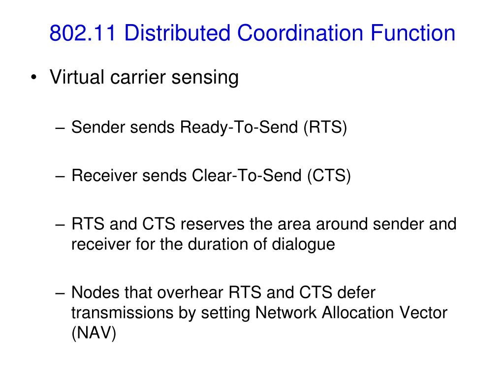 802.11 Distributed Coordination Function • Virtual carrier sensing • Sender sends Ready-To-Send (RTS) • Receiver sends Clear-To-Send (CTS) • RTS and CTS reserves the area around sender and receiver for the duration of dialogue • Nodes that overhear RTS and CTS defer transmissions by setting Network Allocation Vector (NAV)