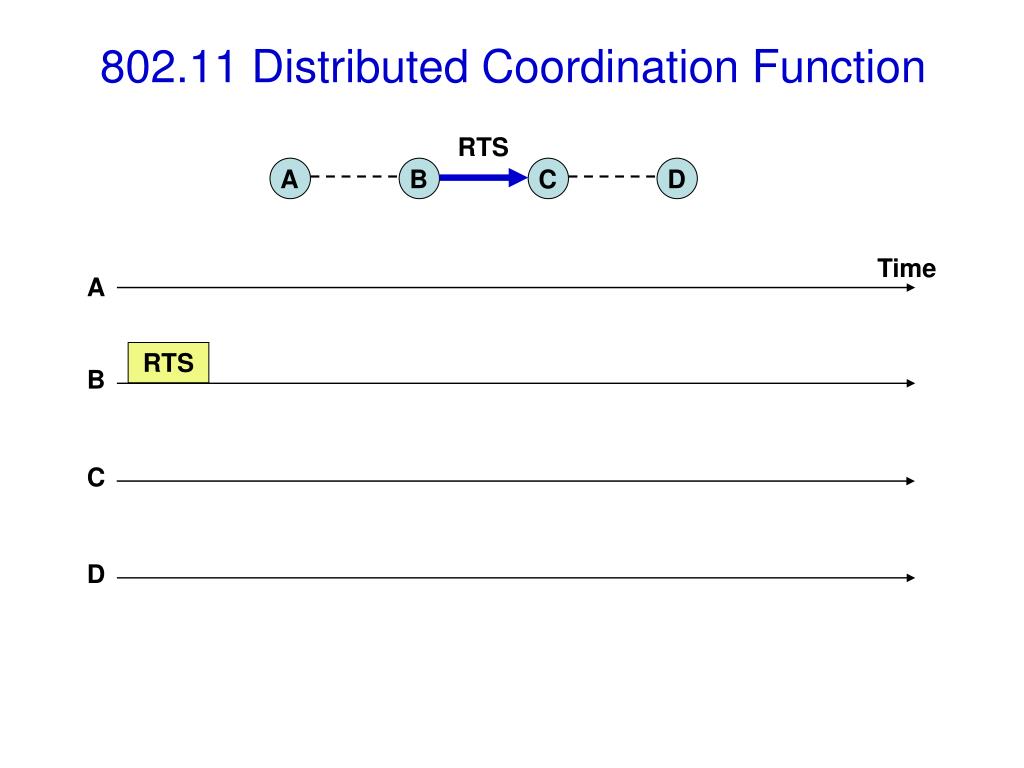 802.11 Distributed Coordination Function RTS A B C D Time A RTS B C D