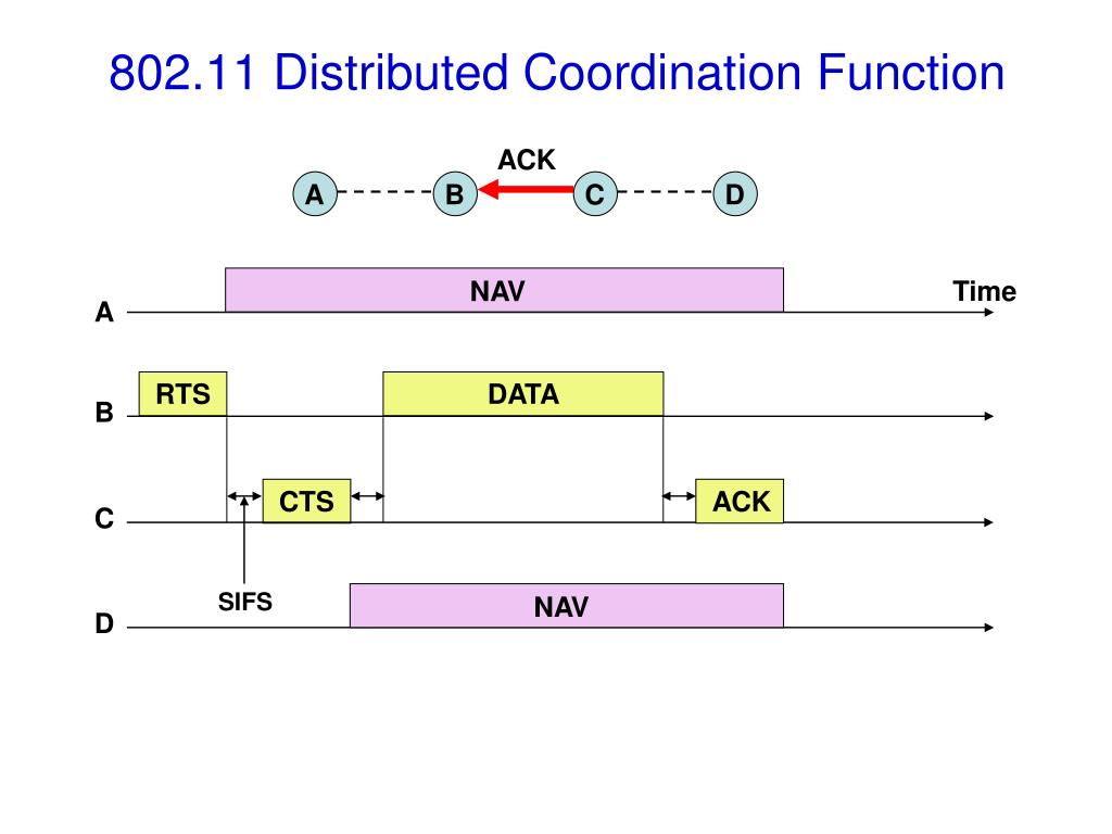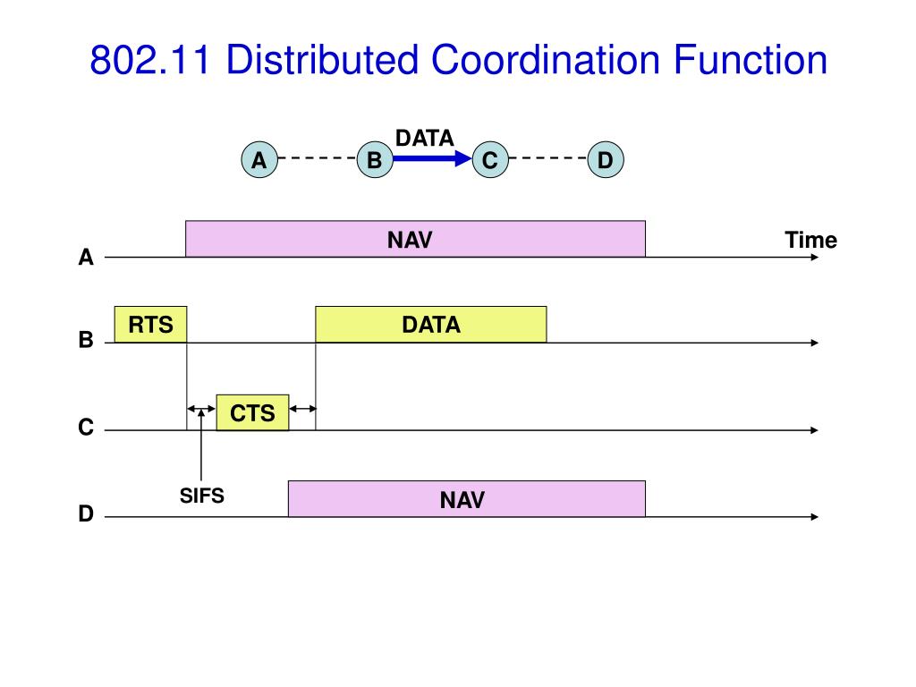 NAV NAV DATA CTS 802.11 Distributed Coordination Function DATA A B C D Time A RTS B C SIFS D